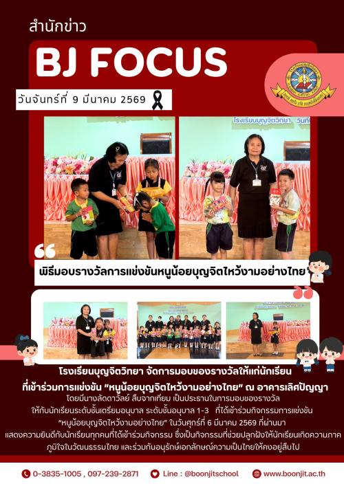 วันจันทร์ที่ 9 มีนาคม 2569 โรงเรียนบุญจิตวิทยา จัดการมอบของรางวัลให้แก่นักเรียน ที่เข้าร่วมการแข่งขัน “หนูน้อยบุญจิตไหว้งามอย่างไทย” ณ อาคารเลิศปัญญา