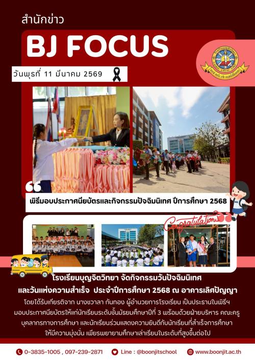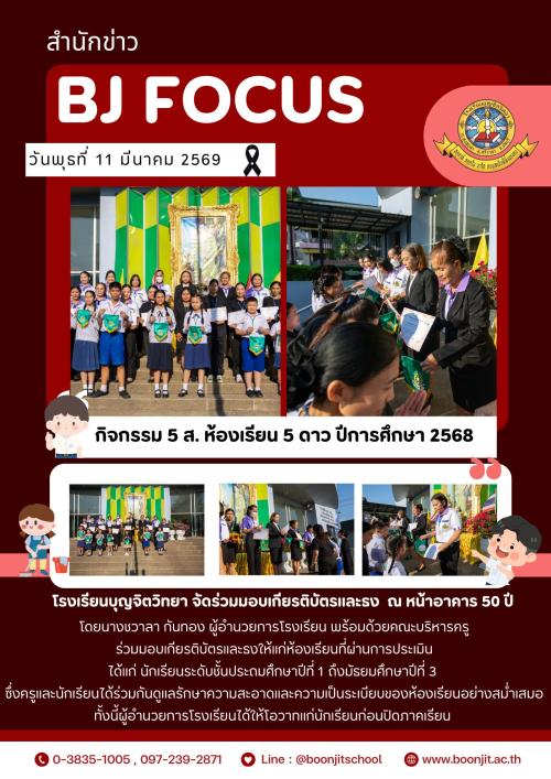 วันพุธที่ 11 มีนาคม 2569 โรงเรียนบุญจิตวิทยา จัดร่วมมอบเกียรติบัตรและธง ณ หน้าอาคาร 50 ปี โดยนางชวาลา กันทอง ผู้อำนวยการโรงเรียน พร้อมด้วยคณะบริหารครู ร่วมมอบเกียรติบัตรและธงให้แก่ห้องเรียนที่ผ่านการประเมิน ได้แก่ นักเรียนระดับชั้นประถมศึกษาปีที่ 1 ถึงมัธยมศึกษาปีที่ 3 ซึ่งครูและนักเรียนได้ร่วมกันดูแลรักษาความสะอาดและความเป็นระเบียบของห้องเรียนอย่างสม่ำเสมอ ทั้งนี้ผู้อำนวยการโรงเรียนได้ให้โอวาทแก่นักเรียนก่อนปิดภาคเรียน
