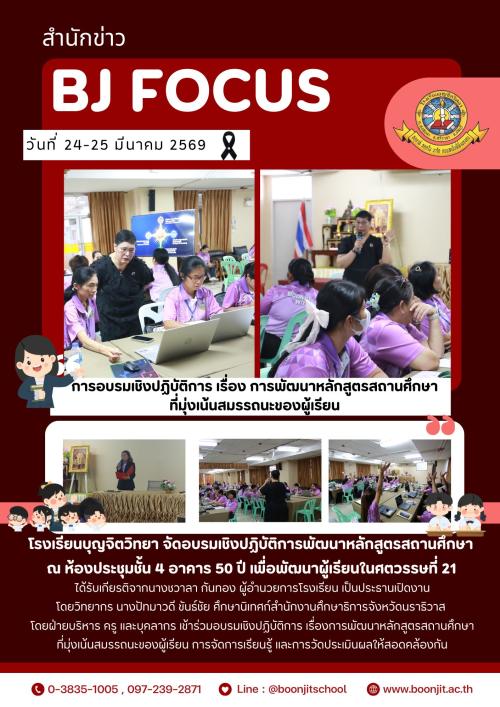 วันที่ 24-25 มีนาคม 2569 โรงเรียนบุญจิตวิทยา จัดอบรมเชิงปฏิบัติการพัฒนาหลักสูตรสถานศึกษา ณ ห้องประชุมชั้น 4 อาคาร 50 ปี เพื่อพัฒนาผู้เรียนในศตวรรษที่ 21
