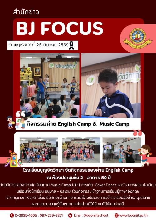 วันพฤหัสบดีที่ 26 มีนาคม 2569 โรงเรียนบุญจิตวิทยา จัดกิจกรรมของค่าย English Camp ณ ห้องประชุมชั้น 2 อาคาร 50 ปี โดยมีการแสดงจากนักเรียนค่าย Music Camp ได้แก่ การเต้น