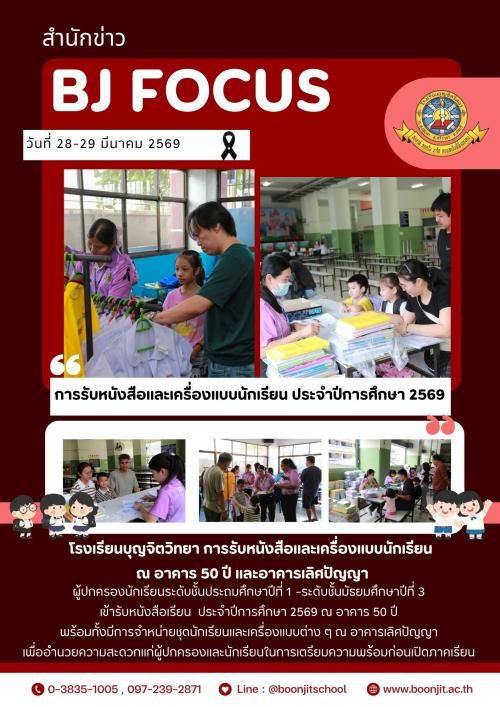 วันที่ 28-29 มีนาคม 2569 โรงเรียนบุญจิตวิทยา การรับหนังสือและเครื่องแบบนักเรียน ณ อาคาร 50 ปี และอาคารเลิศปัญญา ผู้ปกครองนักเรียนระดับชั้นประถมศึกษาปีที่ 1 -ระดับชั้นมัธยมศึกษาปีที่ 3