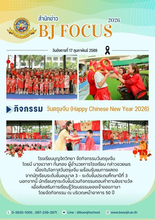 วันอังคารที่ 17 กุมภาพันธ์ 2569 โรงเรียนบุญจิตวิทยา จัดกิจกรรมวันตรุษจีน โดยมี นางชวาลา กันทอง ผู้อำนวยการโรงเรียน กล่าวอวยพรเนื่องในโอกาสวันตรุษจีน พร้อมรับชมการแสดง