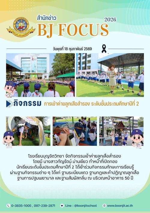 วันพุธที่ 18 กุมภาพันธ์ 2569 โรงเรียนบุญจิตวิทยา จัดกิจกรรมเข้าค่ายลูกเสือสำรอง โดยมี นางสาวกัญรัตน์ ม่านเขียว ทำหน้าที่เปิดกอง นักเรียนระดับชั้นประถมศึกษาปีที่ 2 ได้เข้าร่วมกิจกรรมทักษะ