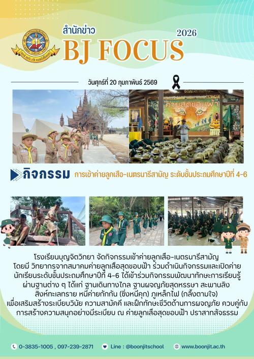 วันศุกร์ที่ 20 กุมภาพันธ์ 2569 โรงเรียนบุญจิตวิทยา จัดกิจกรรมเข้าค่ายลูกเสือ–เนตรนารีสามัญ โดยมี วิทยากรจากสมาคมค่ายลูกเสือสุดขอบฟ้า