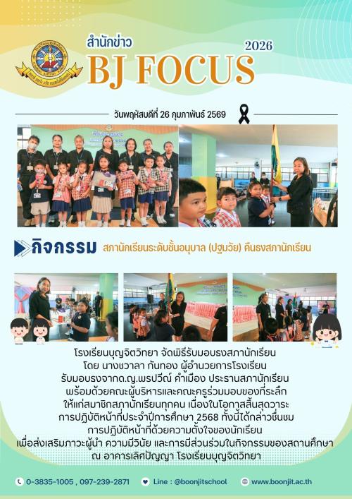 วันจันทร์ที่ 2 มีนาคม 2569 โรงเรียนบุญจิตวิทยา จัดพิธีมอบเกียรติบัตรแก่คณะสภานักเรียน และพิธีคืนปลอกแขนพร้อมธงสภานักเรียน ประจำปีการศึกษา 2568 ณ อาคาร 50 ปี