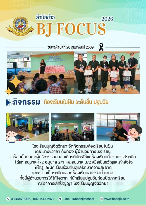 วันพุธที่ 11 มีนาคม 2569 โรงเรียนบุญจิตวิทยา จัดร่วมมอบเกียรติบัตรและธง ณ หน้าอาคาร 50 ปี โดยนางชวาลา กันทอง ผู้อำนวยการโรงเรียน พร้อมด้วยคณะบริหารครู ร่วมมอบเกียรติบัตรและธงให้แก่ห้องเรียนที่ผ่านการประเมิน ได้แก่ นักเรียนระดับชั้นประถมศึกษาปีที่ 1 ถึงมัธยมศึกษาปีที่ 3 ซึ่งครูและนักเรียนได้ร่วมกันดูแลรักษาความสะอาดและความเป็นระเบียบของห้องเรียนอย่างสม่ำเสมอ ทั้งนี้ผู้อำนวยการโรงเรียนได้ให้โอวาทแก่นักเรียนก่อนปิดภาคเรียน