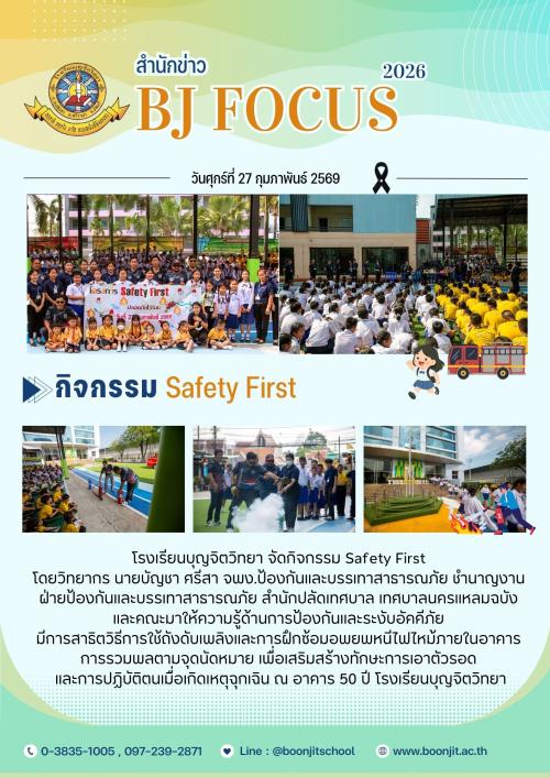 วันศุกร์ที่ 27 กุมภาพันธ์ 2569 โรงเรียนบุญจิตวิทยา จัดกิจกรรม Safety First โดยวิทยากร นายบัญชา ศรีสา จพง.ป้องกันและบรรเทาสาธารณภัย ชำนาญงาน ฝ่ายป้องกันและบรรเทาสาธารณภัย