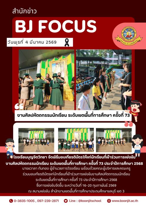 วันพุธที่ 4 มีนาคม 2569 โรงเรียนบุญจิตวิทยา จัดพิธีมอบเกียรติบัตรให้แก่นักเรียนที่เข้าร่วมการแข่งขันงานศิลปหัตถกรรมนักเรียน ระดับเขตพื้นที่การศึกษา ครั้งที่ 73 ประจำปีการศึกษา 2568