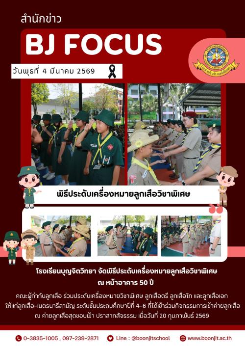 วันพุธที่ 4 มีนาคม 2569 โรงเรียนบุญจิตวิทยา จัดพิธีประดับเครื่องหมายลูกเสือวิชาพิเศษ ณ หน้าอาคาร 50 ปี คณะผู้กำกับลูกเสือ ร่วมประดับเครื่องหมายวิชาพิเศษ