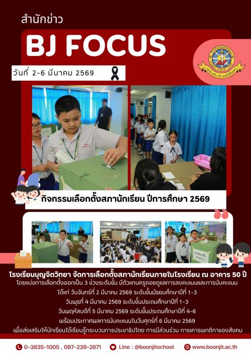 วันที่ 2-6 มีนาคม 2569 โรงเรียนบุญจิตวิทยา จัดการเลือกตั้งสภานักเรียนภายในโรงเรียน ณ อาคาร 50 ปี โดยแบ่งการเลือกตั้งออกเป็น 3 ช่วงระดับชั้น มีตัวแทนครูคอยดูแลการลงคะแนนและการนับ