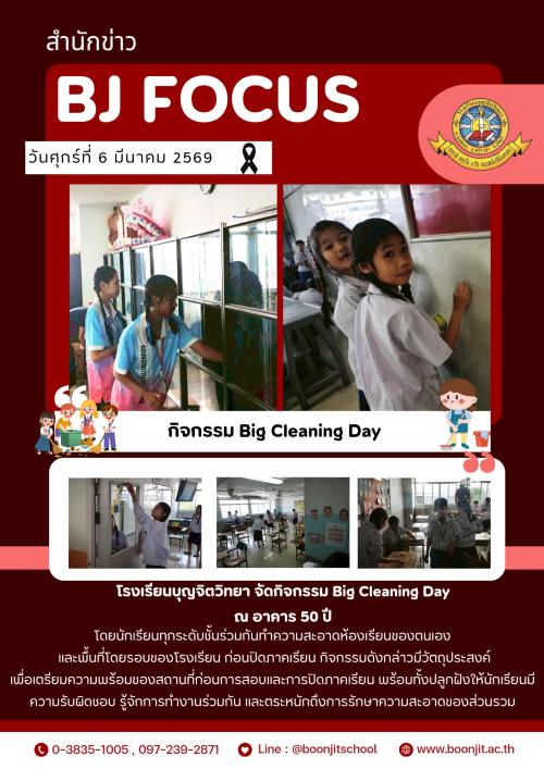 วันศุกร์ที่ 6 มีนาคม 2569 โรงเรียนบุญจิตวิทยา จัดกิจกรรม Big Cleaning Day ณ อาคาร 50 ปี โดยนักเรียนทุกระดับชั้นร่วมกันทำความสะอาดห้องเรียนของตนเอง