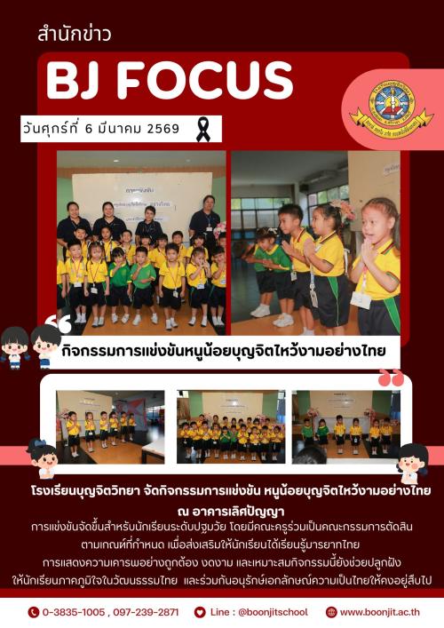 วันศุกร์ที่ 6 มีนาคม 2569 โรงเรียนบุญจิตวิทยา จัดกิจกรรมการแข่งขัน หนูน้อยบุญจิตไหว้งามอย่างไทย ณ อาคารเลิศปัญญา การแข่งขันจัดขึ้นสำหรับนักเรียนระดับปฐมวัย