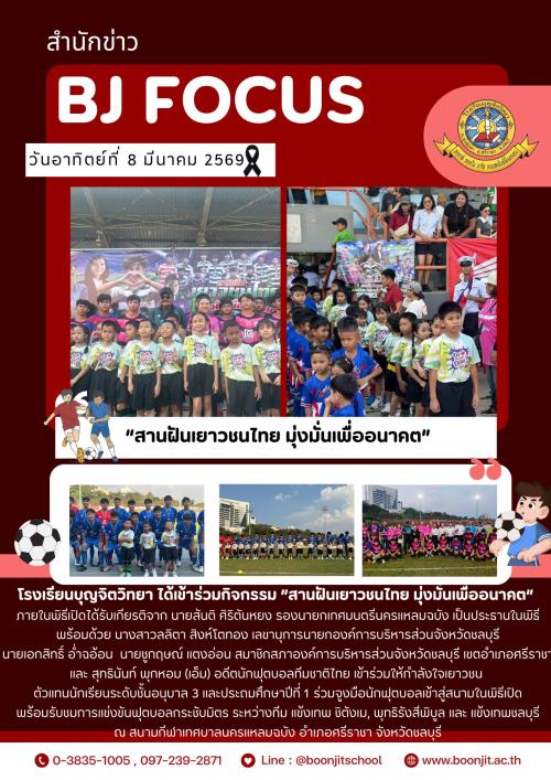 วันอาทิตย์ที่ 8 มีนาคม 2569 โรงเรียนบุญจิตวิทยา ได้เข้าร่วมกิจกรรม “สานฝันเยาวชนไทย มุ่งมั่นเพื่ออนาคต” ณ สนามกีฬาเทศบาลนครแหลมฉบัง อำเภอศรีราชา จังหวัดชลบุรี