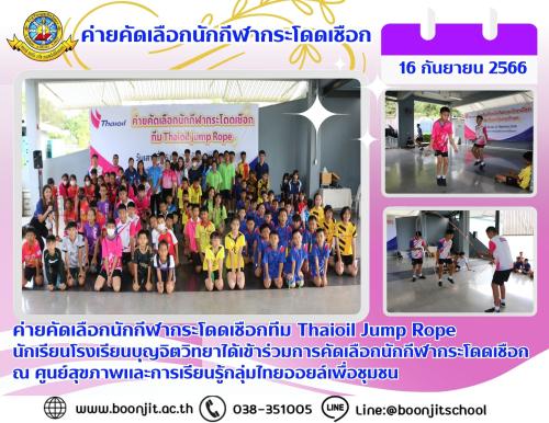 วันเสาร์ที่ 16 กันยายน 2566 นักเรียนโรงเรียนบุญจิตวิทยาได้เข้าร่วมการคัดเลือกนักกีฬากระโดดเชือก ค่ายคัดเลือกนักกีฬากระโดดเชือกทีม Thaioil Jump Rope ณ ศูนย์สุขภาพและการเรียนรู้กลุ่มไทยออยล์เพื่อชุมชน