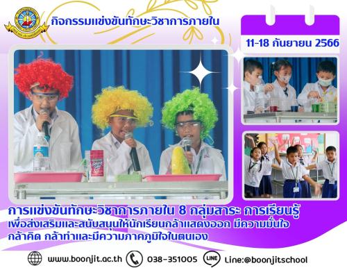 โรงเรียนบุญจิตวิทยา ได้จัดกิจกรรมแข่งขันทักษะวิชาการภายในในวันที่ 11-18 กันยายน 2566 ในรายวิชาภาษาไทย ภาษาอังกฤษ คณิตศาสตร์ สังคมศึกษา วิทยาศาสตร์ ภาษาจีน