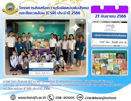 วันที่ 27 กันยายน 2566 โรงเรียนบุญจิตวิทยา โดยมีนางชวาลา กันทอง ผู้อำนวยการโรงเรียนและคณะ เป็นตัวแทนรับมอบหนังสือ จากกลุ่มอุตสาหกรรมโรงกลั่นน้ำมันปิโตรเลียม สภาอุตสาหกรรมแห่งประเทศไทย