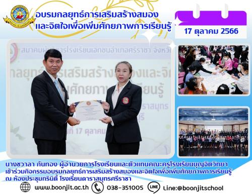 วันอังคารที่ 17 ตุลาคม 2566 นางชวาลา กันทอง ผู้อำนวยการโรงเรียนและตัวแทนคณะครูโรงเรียนบุญจิตวิทยาเข้าร่วมกิจกรรมอบรม