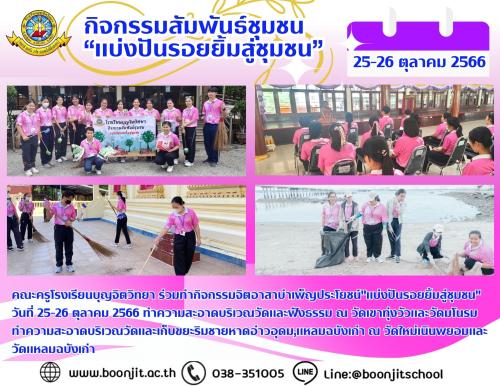 วันที่ 25-26 ตุลาคม 2566 ร่วมทำกิจกรรมจิตอาสาบำเพ็ญประโยชน์ "แบ่งปันรอยยิ้มสู่ชุมชน"ทำความสะอาดบริเวณวัด ฟังธรรม