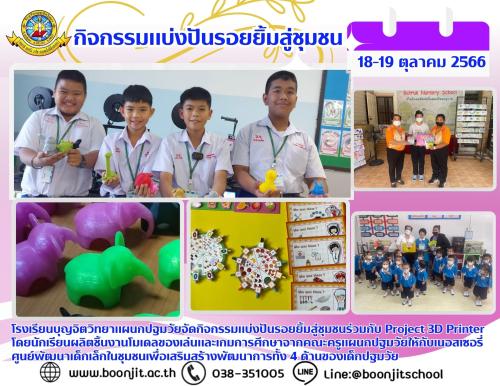 วันที่ 18-19 ตุลาคม 2566 โรงเรียนบุญจิตวิทยาแผนกปฐมวัยจัดกิจกรรมแบ่งปันรอยยิ้มสู่ชุมชนร่วมกับ Project 3D Printer นักเรียนผลิตชิ้นงานโมเดลของเล่นและเกมการศึกษา