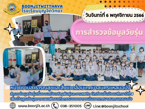 วันจันทร์ที่ 6 พฤศจิกายน 2566 นักเรียนระดับชั้นมัธยมศึกษาปีที่ 3 เพื่อเป็นฐานข้อมูลวางแผนพัฒนากิจกรรมของเยาวชน ณ ห้องประชุมชั้น 2 อาคาร 50 ปี