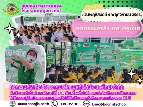 วันพฤหัสบดีที่ 9 พฤศจิกายน 2566 นักเรียนระดับชั้นประถมศึกษาปีที่ 1-6 รับเครื่องดื่มไมโล และเข้าร่วมกิจกรรมนันทนาการได้รับความรู้ด้านโภชนาการและส่งเสริมให้นักเรียนออกกำลังกาย