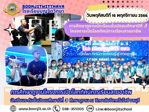 วันพฤหัสบดีที่ 16 พฤศจิกายน 2566 นักเรียนระดับชั้นมัธยมศึกษาปีที่ 3 ได้ศึกษาดูงาน ณ วิทยาลัยอีเทคโนโลยี ชลบุรี