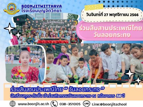 วันจันทร์ที่ 27 พฤศจิกายน 2566 ร่วมสืบสานประเพณีไทย “วันลอยกระทง” นักเรียนทุกระดับชั้น เข้าร่วมกิจกรรมวันลอยกระทง ณ หน้าอาคาร 50 ปี
