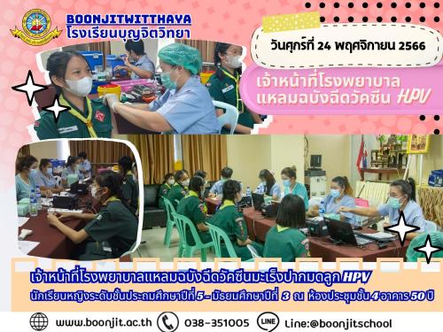 วันศุกร์ที่ 24 พฤศจิกายน 2566 เวลา 09.30-12.00น. เจ้าหน้าที่ รพ.แหลมฉบัง ฉีดวัคซีนHPV ให้แก่นักเรียนหญิง