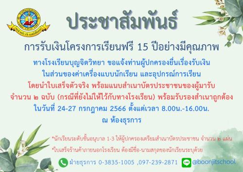 การรับเงินโครงการเรียนฟรี 15 ปี อย่างมีคุณภาพ ทางโรงเรียนบุญจิตวิทยา ขอแจ้งท่านผุ้ปกครองยื่นเรื่องรับเงินในส่วนของค่าเครื่องแบบนักเรียน และอุปกรณ์การเรียน