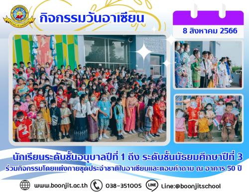 โรงเรียนบุญจิตวิทยาจัดกิจกรรมวันอาเซียน นักเรียนระดับชั้นอนุบาลปีที่ 1 ถึงนักเรียนระดับชั้นมัธยมศึกษาปีที่ 3 ร่วมกิจกรรมแต่งกายชุดประจำชาติ