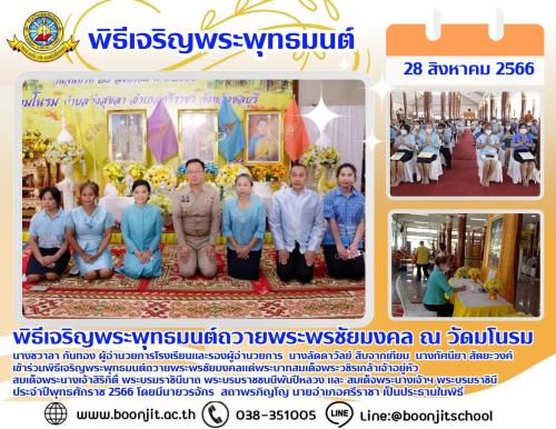 วันจันทร์ที่ 28 สิงหาคม 2566 พิธีเจริญพระพุทธมนต์ถวายพระพรชัยมงคล นางชวาลา กันทอง ผู้อำนวยการโรงเรียนและรองผู้อำนวยการ นางลัดดาวัลย์ สืบจากเทียม นางทัศนียา สัตยะวงค์