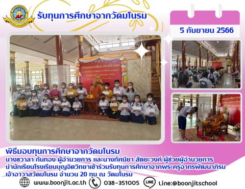 วันอังคารที่ 5 กันยายน 2566 รับทุนการศึกษาจากวัดมโนรมณ ณ วัดมโนรม นางชวาลา กันทอง ผู้อำนวยการ โรงเรียนบุญจิตวิทยา และนางทัศนียา สัตยะวงค์ ผู้ช่วยผู้อำนวยการ