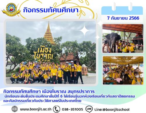 วันพฤหัสบดีที่ 7 กันยายน 2566 กิจกรรมทัศนศึกษา เมืองโบราณ สมุทรปราการ นักเรียนระดับชั้นประถมศึกษาชั้นปีที่ 6 ได้เรียนรู้นอกห้องเรียน