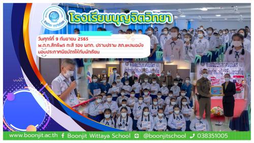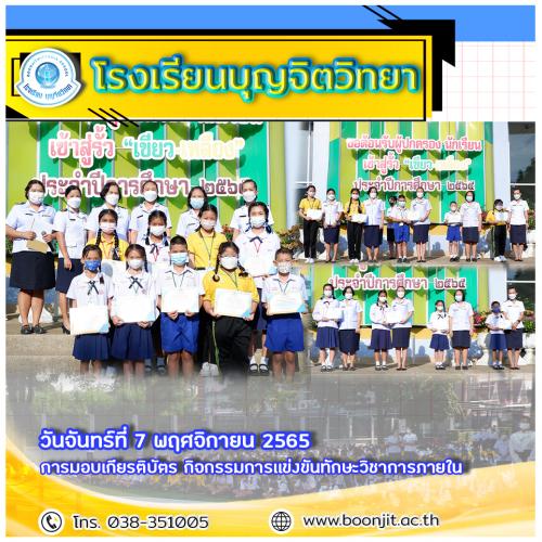 วันจันทร์ที่ 7 พฤศจิกายน 2565 ผู้อำนวยการโรงเรียนบุญจิตวิทยา นางชวาลา กันทอง มอบเกียรติบัตรการเเข่งขันทักษะวิชาการภายใน
