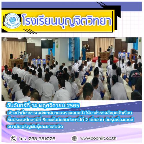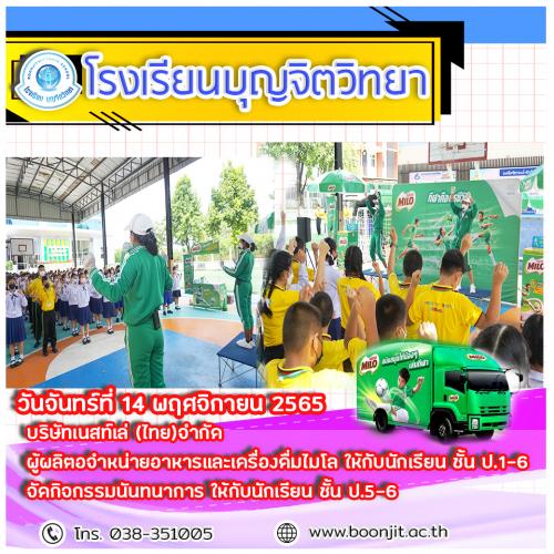 วันจันทร์ที่ 14 พฤศจิกายน 2565 โรงเรียนบุญจิตวิทยา นักเรียนชั้นประถมศึกษาปีที่1-6 ได้รับความรู้ทางโภชนาการส่งเสริมการเล่นกีฬา