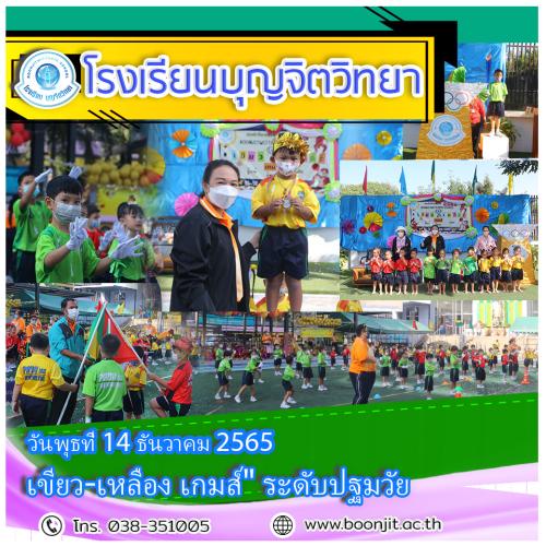 วันพุธที่ 14 ธันวาคม 2565 โรงเรียนบุญจิตวิทยา ได้จัดกิจกรรมการแข่งขันกีฬาภายในนักเรียนระดับปฐมวัย " เขียว-เหลือง เกมส์" ประจำปีการศึกษา 2565