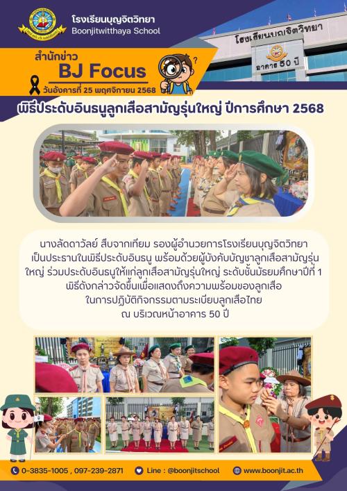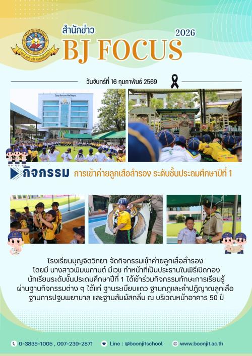วันจันทร์ที่ 16 กุมภาพันธ์ 2569 โรงเรียนบุญจิตวิทยา จัดกิจกรรมเข้าค่ายลูกเสือสำรอง โดยมี นางสาวพิมพกานต์ มีเวช ทำหน้าที่เป็นประธานในพิธีเปิดกองนักเรียนระดับชั้นประถมศึกษาปีที่ 1