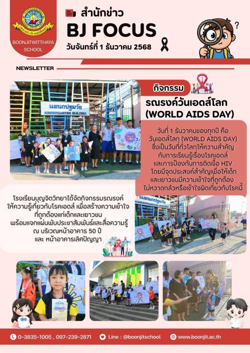 วันจันทร์ที่ 1 ธันวาคม 2568 โรงเรียนบุญจิตวิทยาได้จัดกิจกรรมรณรงค์ ให้ความรู้เกี่ยวกับโรคเอดส์ เพื่อสร้างความเข้าใจที่ถูกต้องแก่เด็กและเยาวชน