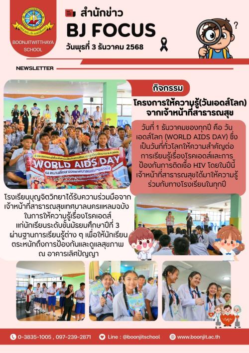 วันพุธที่ 3 ธันวาคม 2568 โรงเรียนบุญจิตวิทยาได้รับความร่วมมือจาก เจ้าหน้าที่สาธารณสุขเทศบาลนครแหลมฉบัง ในการให้ความรู้เรื่องโรคเอดส์แก่นักเรียนระดับชั้นมัธยมศึกษาปีที่ 3