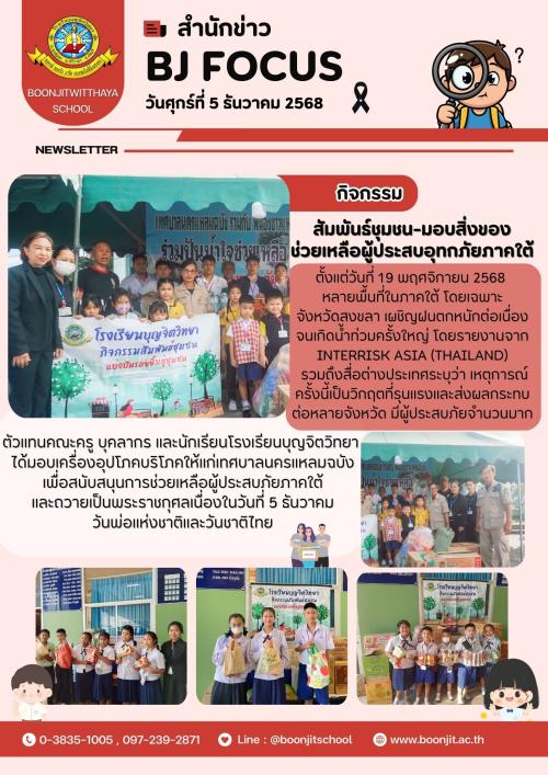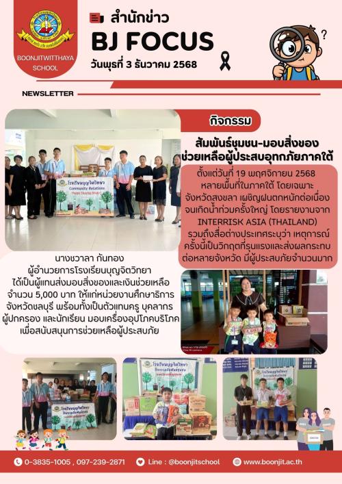 วันศุกร์ที่ 5 ธันวาคม 2568 ตัวแทนคณะครู บุคลากร และนักเรียนโรงเรียนบุญจิตวิทยาได้มอบเครื่องอุปโภคบริโภคให้แก่เทศบาลนครแหลมฉบังเพื่อสนับสนุนการช่วยเหลือผู้ประสบภัยภาคใต้