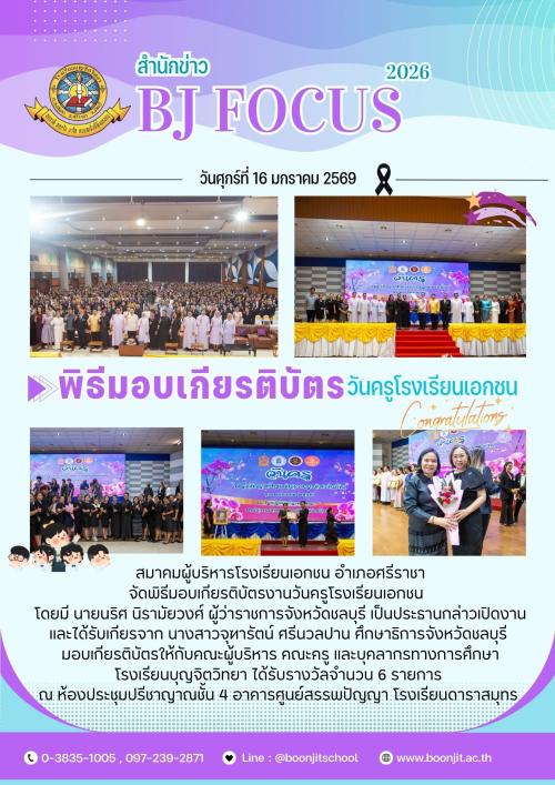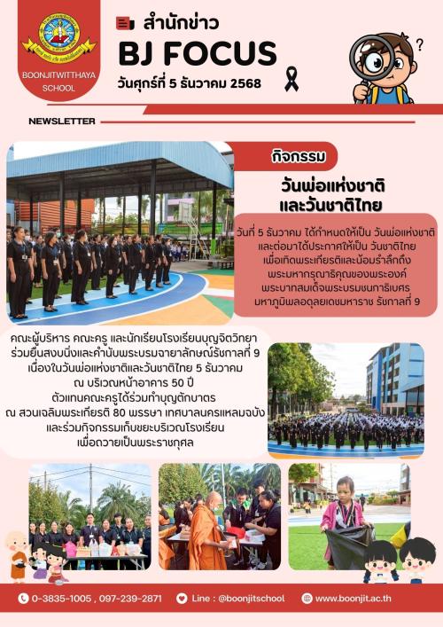 วันศุกร์ที่ 5 ธันวาคม 2568 คณะผู้บริหาร คณะครู และนักเรียนโรงเรียนบุญจิตวิทยา ร่วมยืนสงบนิ่งและคำนับพระบรมฉายาลักษณ์รัชกาลที่ 9