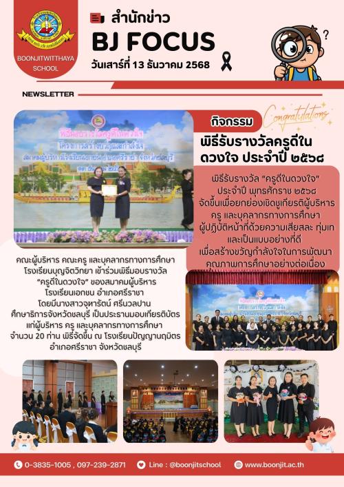 วันเสาร์ที่ 13 ธันวาคม 2568 คณะผู้บริหาร คณะครู และบุคลากรทางการศึกษา โรงเรียนบุญจิตวิทยา เข้าร่วมพิธีมอบรางวัล