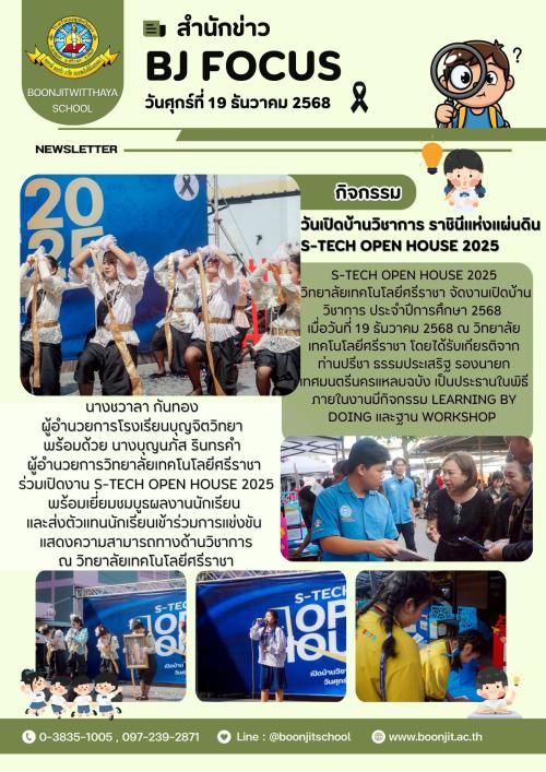 วันศุกร์ที่ 19 ธันวาคม 2568 นางชวาลา กันทอง ผู้อำนวยการโรงเรียนบุญจิตวิทยา พร้อมด้วย นางบุญนภัส รินทรคำ ผู้อำนวยการวิทยาลัยเทคโนโลยีศรีราชา