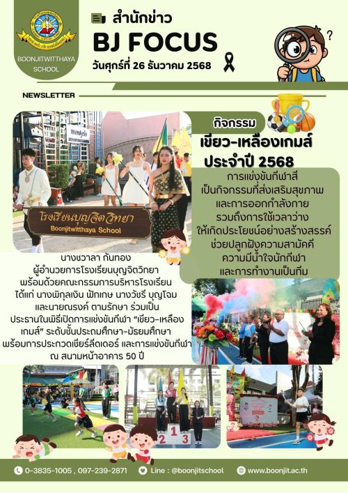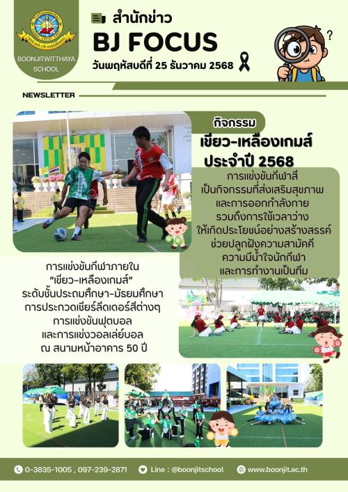 วันพฤหัสบดีที่ 25 ธันวาคม 2568 การแข่งขันกีฬาภายใน“เขียว–เหลืองเกมส์” ระดับชั้นประถมศึกษา–มัธยมศึกษา