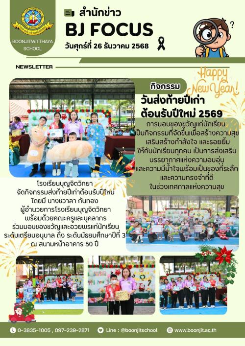 วันศุกร์ที่ 26 ธันวาคม 2568 นางชวาลา กันทอง ผู้อำนวยการโรงเรียนบุญจิตวิทยา พร้อมด้วยคณะกรรมการบริหารโรงเรียน ได้แก่ นางพิกุลเงิน ฟักเกษ นางวัชรี บุญโฉม และนายณรงค์ ตามรักษา