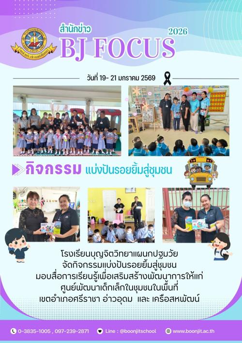 วันที่ 19- 21 มกราคม 2569 โรงเรียนบุญจิตวิทยาแผนกปฐมวัย จัดกิจกรรมแบ่งปันรอยยิ้มสู่ชุมชน มอบสื่อการเรียนรู้เพื่อเสริมสร้างพัฒนาการให้แก่ ศูนย์พัฒนาเด็กเล็กในชุมชนในพื้นที่เขตอำเภอศรีราชา อ่าวอุดม และ เครือสหพัฒน์