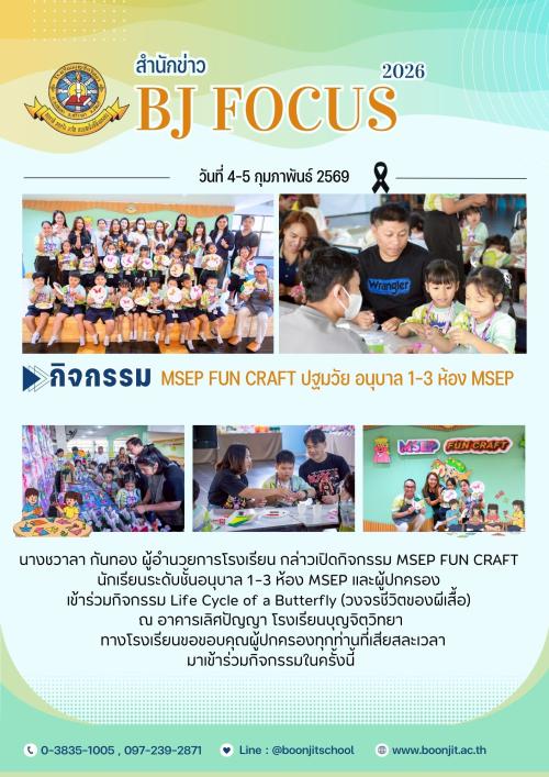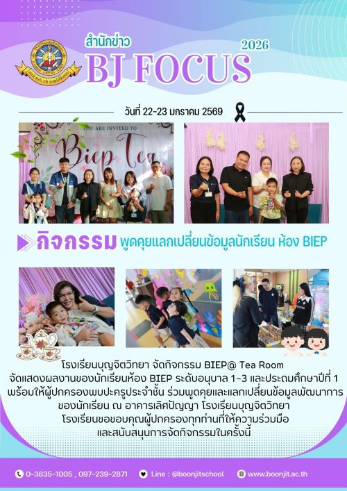 วันพฤหัสบดีที่ 22 และ วันศุกร์ที่ 23 มกราคม 2569 โรงเรียนบุญจิตวิทยา จัดกิจกรรม BIEP@ Tea Room จัดแสดงผลงานของนักเรียนห้อง BIEP ระดับอนุบาล 1–3 และประถมศึกษาปีที่ 1