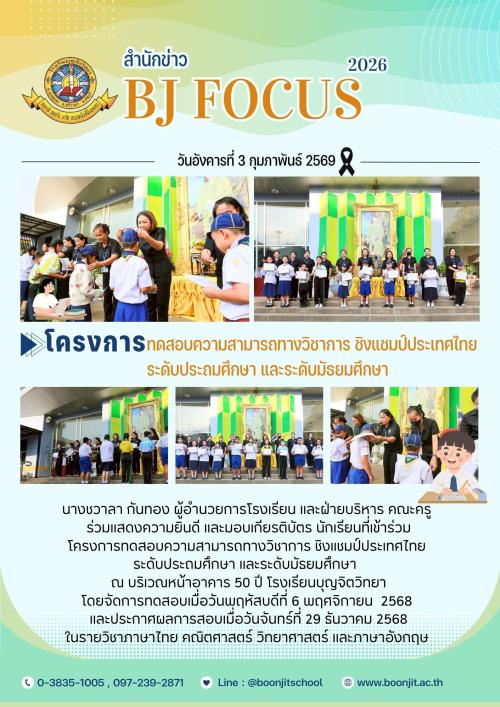 วันอังคารที่ 3 กุมภาพันธ์ 2569 นางชวาลา กันทอง ผู้อำนวยการโรงเรียน และฝ่ายบริหาร คณะครู ร่วมแสดงความยินดี และมอบเกียรติบัตร นักเรียนที่เข้าร่วม โครงการทดสอบความสามารถทางวิชาการ ชิงแชมป์ประเทศไทย