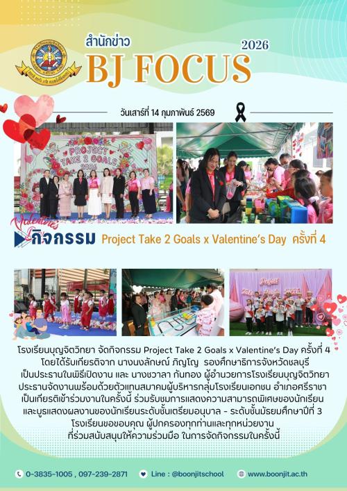 วันเสาร์ที่ 14 กุมภาพันธ์ 2569 โรงเรียนบุญจิตวิทยา จัดกิจกรรม Project Take 2 Goals x Valentine’s Day ครั้งที่ 4 โดยได้รับเกียรติจาก นางนงลักษณ์ ภิญโญ รองศึกษาธิการจังหวัดชลบุรี เป็นประธานในพิธีเปิดงาน และ นางชวาลา กันทอง ผู้อำนวยการโรงเรียนบุญจิตวิทยา ประธานจัดงานพร้อมด้วยตัวแทนสมาคมผู้บริหารกลุ่มโรงเรียนเอกชน