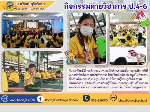 วันพฤหัสบดีที่ 28 สิงหาคม 2568 นักเรียนระดับชั้นประถมศึกษาปีที่ 4-6 เข้าร่วมกิจกรรมค่ายวิชาการ ไทย วิทย์ คณิต อังกฤษ ในกิจกรรมมีการ
